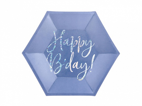 Sada 6-ti kusů papírových párty talířků v modré barvě s nápisem Happy B'day! Průměr talíře je 20 cm.